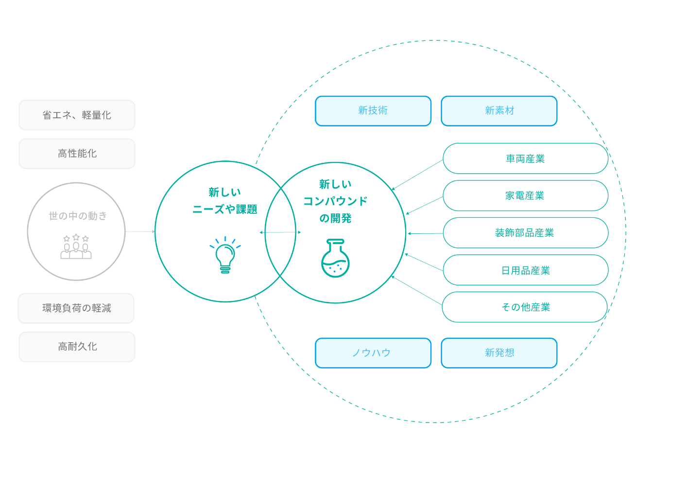 弊社は、機能性プラスチックコンパウンドの開発と製造に関する高度な技術と、様々な樹脂・添加剤に関するノウハウを駆使して、 お客様の様々なご要望に対応する最適なコンパウンドをご提供しています。